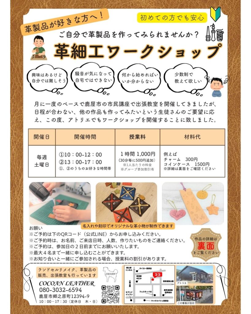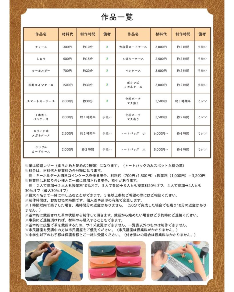 | 制作できる革製品 | チャーム(300円)、しおり(700円)、キーホルダー(700円)、 コインケース(1,500円)など(縫製が必要でない作品) |